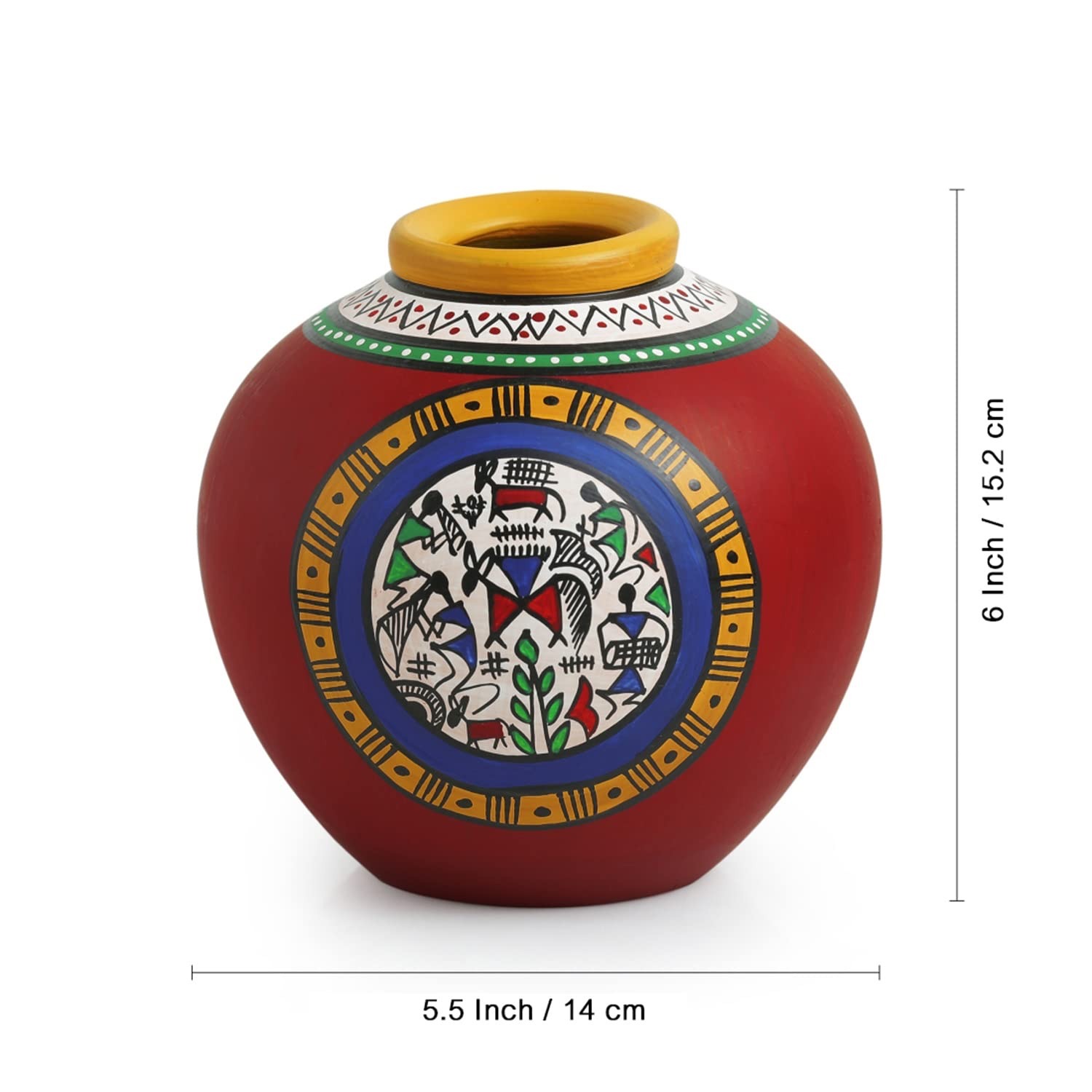 Leafy Warli Tales’ Hand-Painted Terracotta Vases (Set of 2, Red)