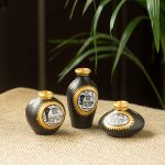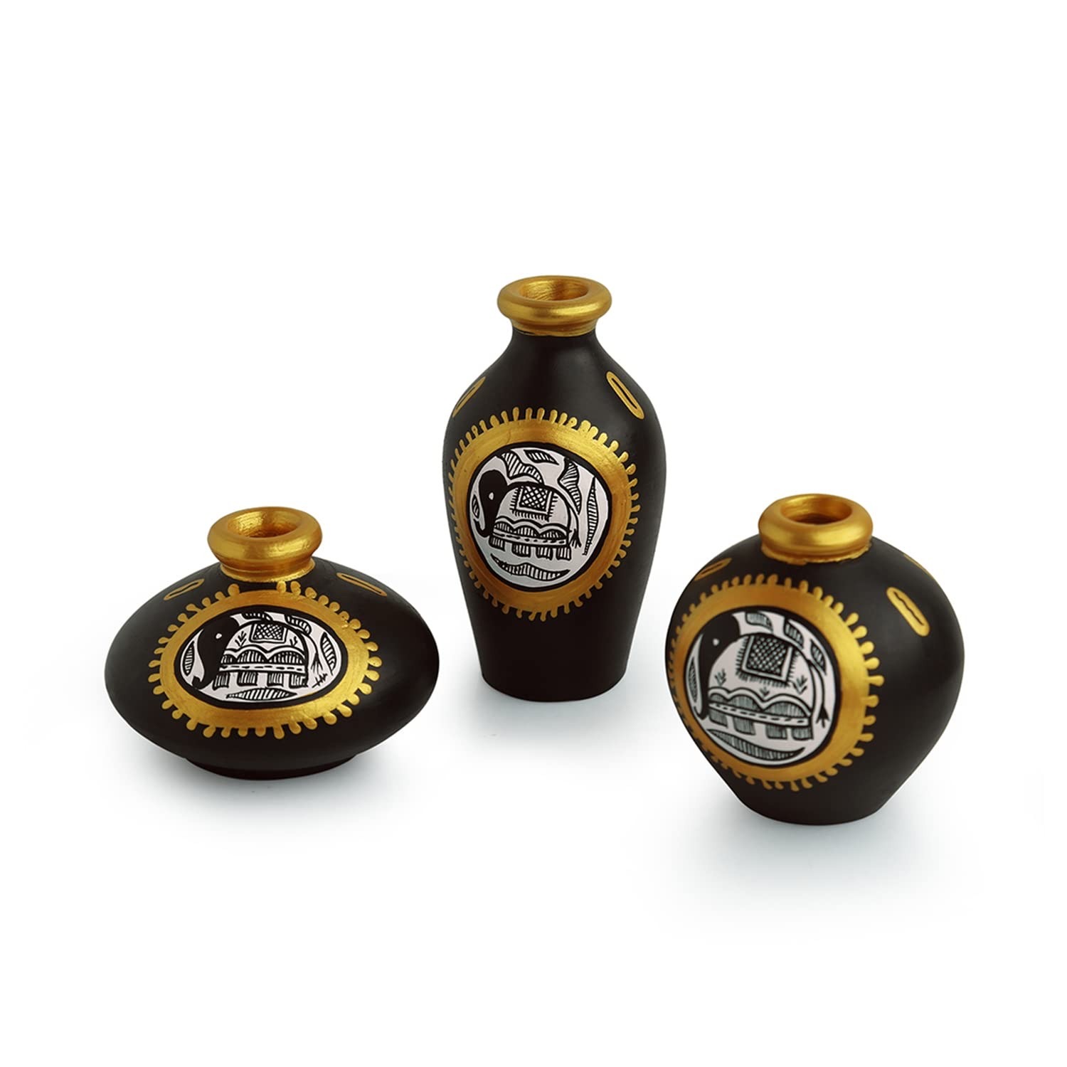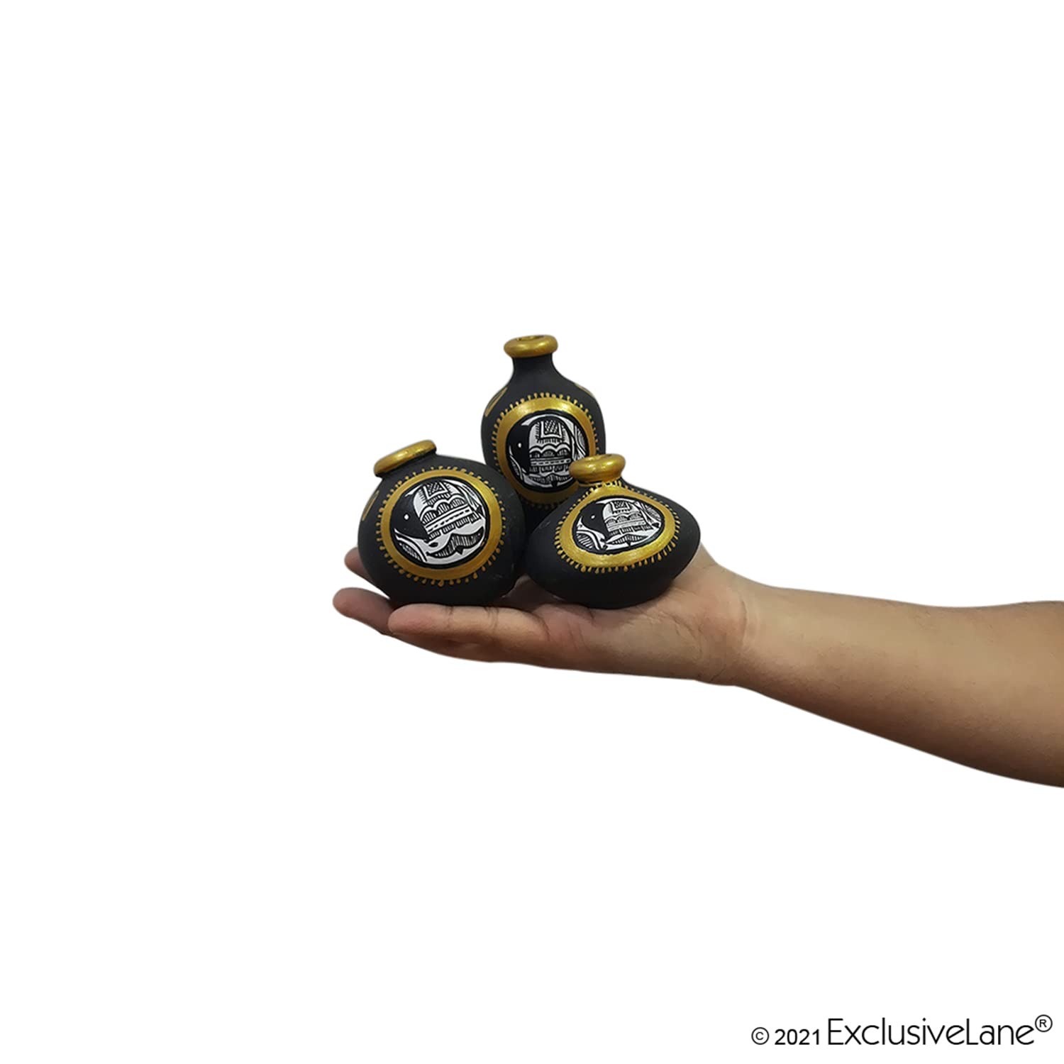Terracotta Warli Handpainted Miniature Black Pots Showpieces (Set Of 3)