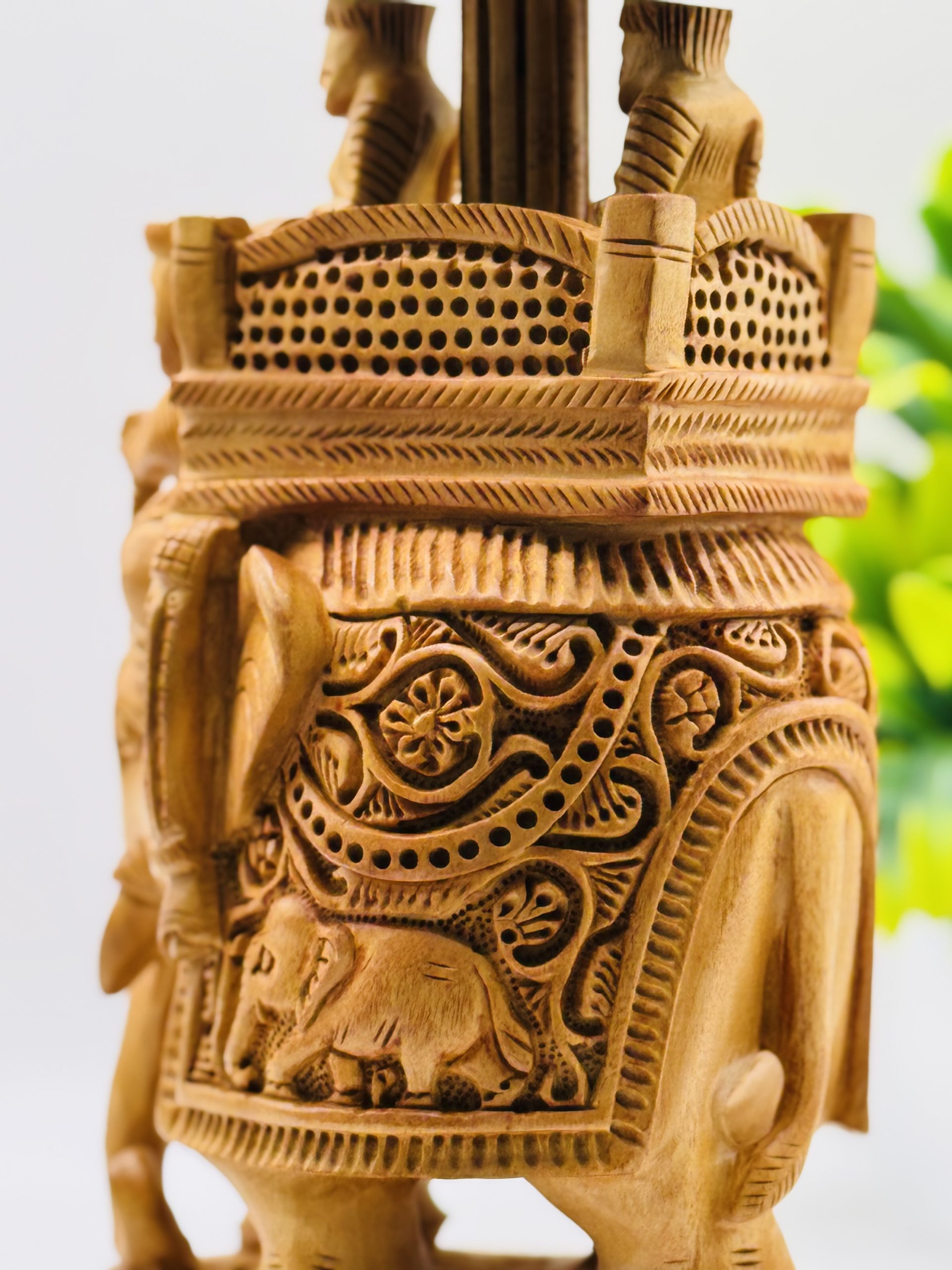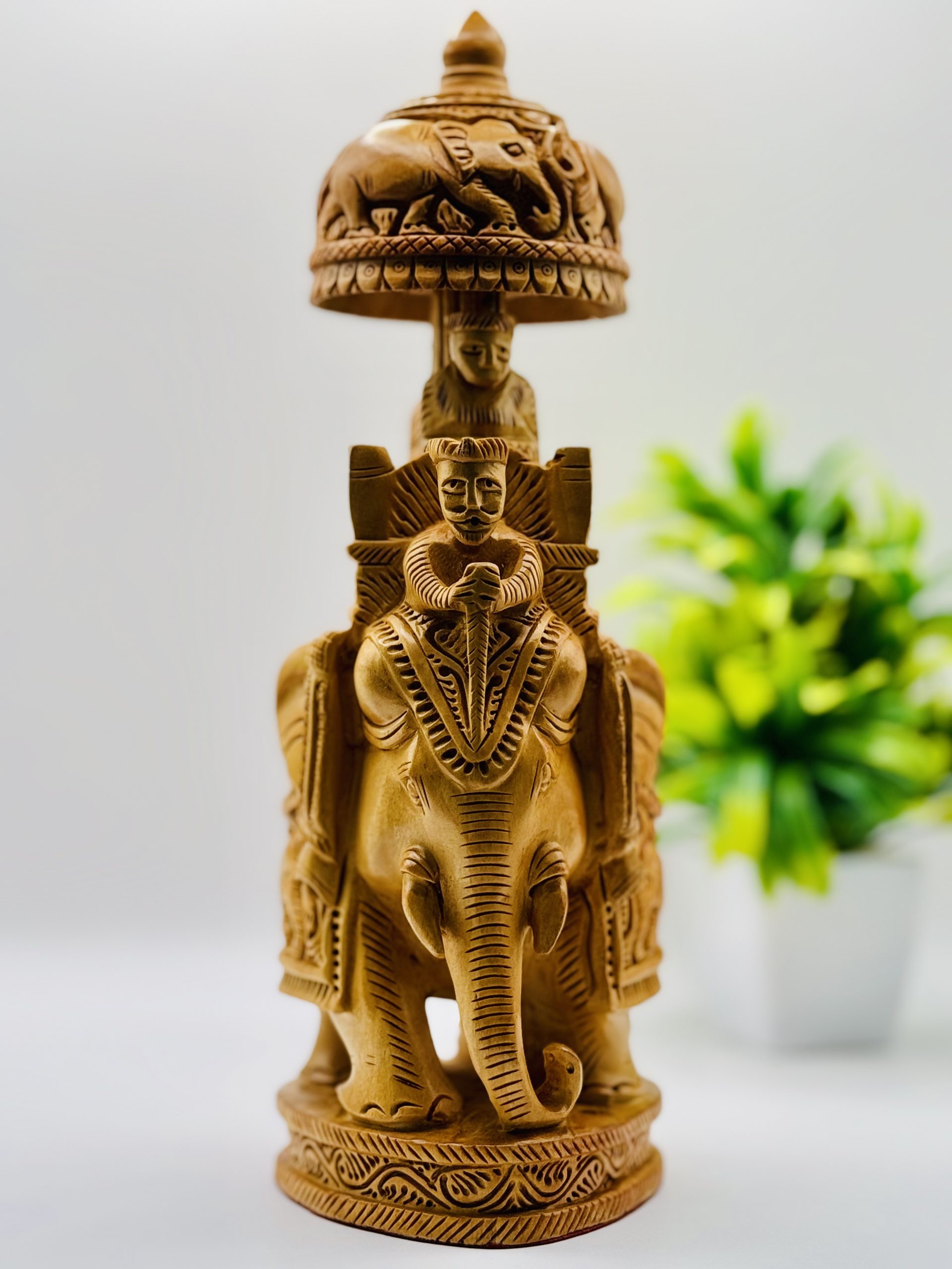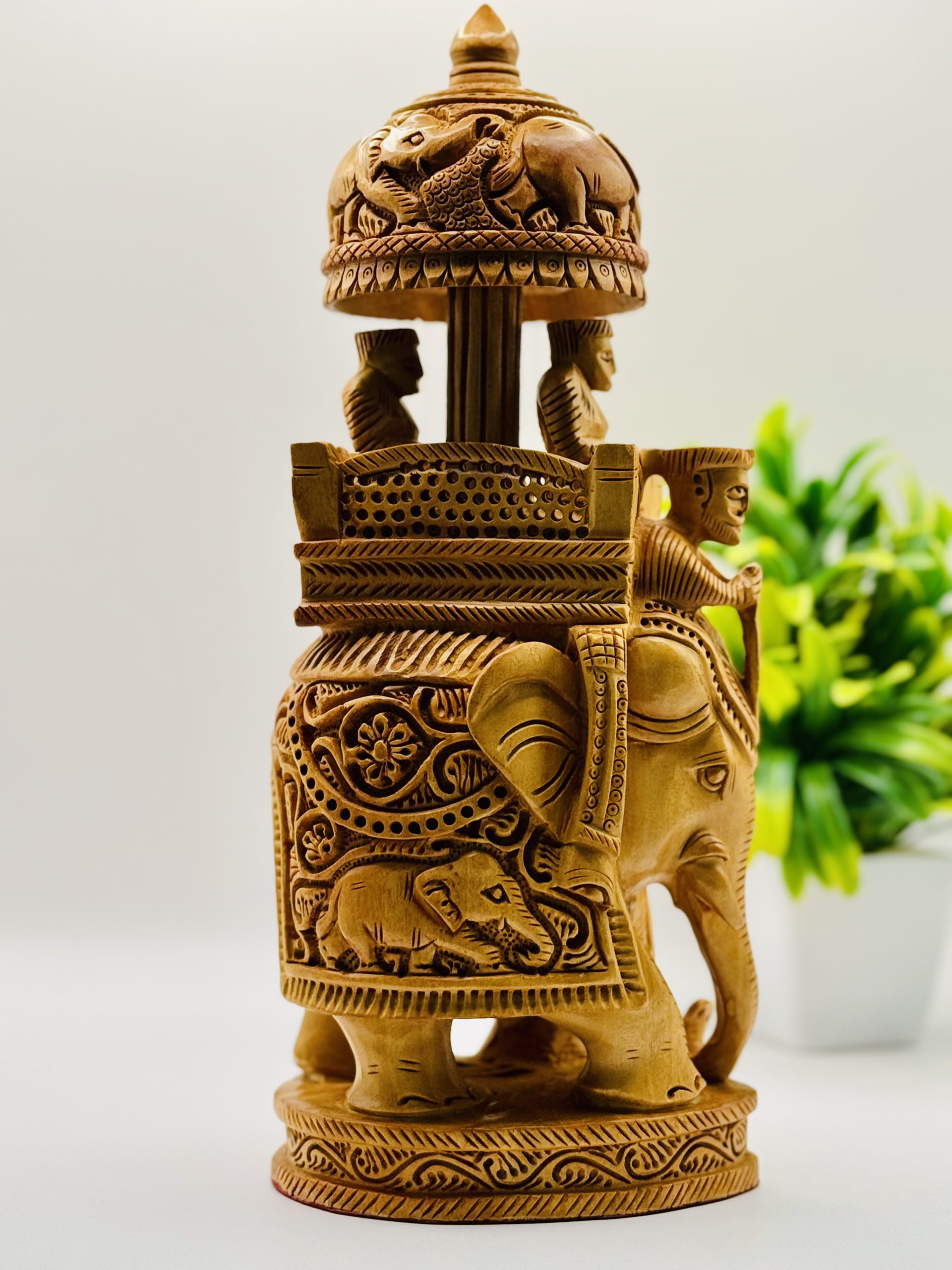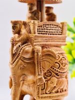 Add a touch of elegance to your table decor with this elegant wooden ambari fine carving elephant. Crafted from high-quality wood, it features intricate designs and a durable build. Ideal for table ascent and gifting, this piece brings sophistication to any setting.